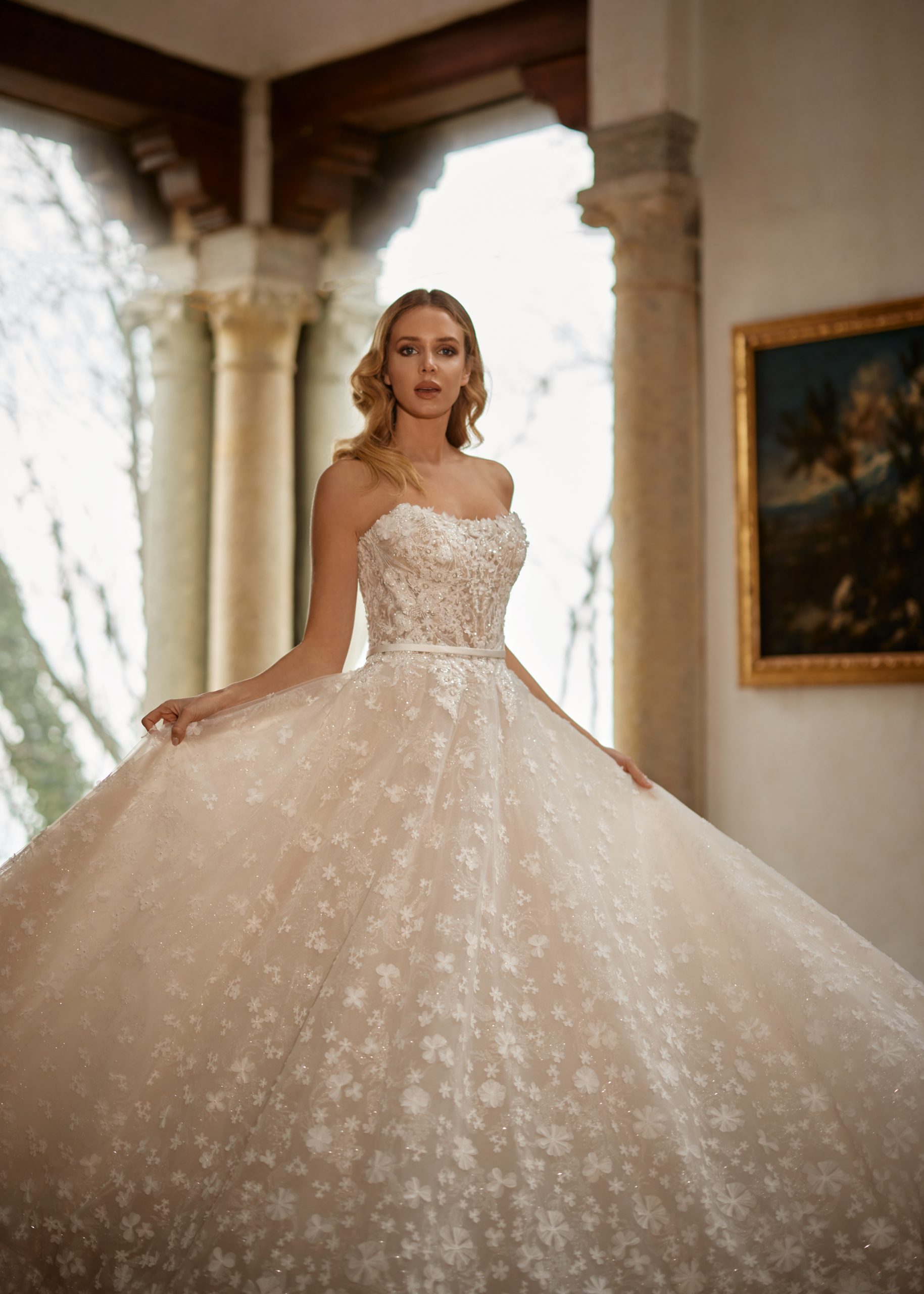 Felicity is a glistening romantic ballgown. It has a structured strapless scoop neck top that flows beautifully to a mid scoop back. Felicity shines with the touch of sparkle tulle and beautiful three-dimensional floral appliques. This gown comes with a detachable belt that sits at the waist and attaches to the buttons along the back adding a classic touch. Felicity is perfect for a dreamy fairytale wedding.