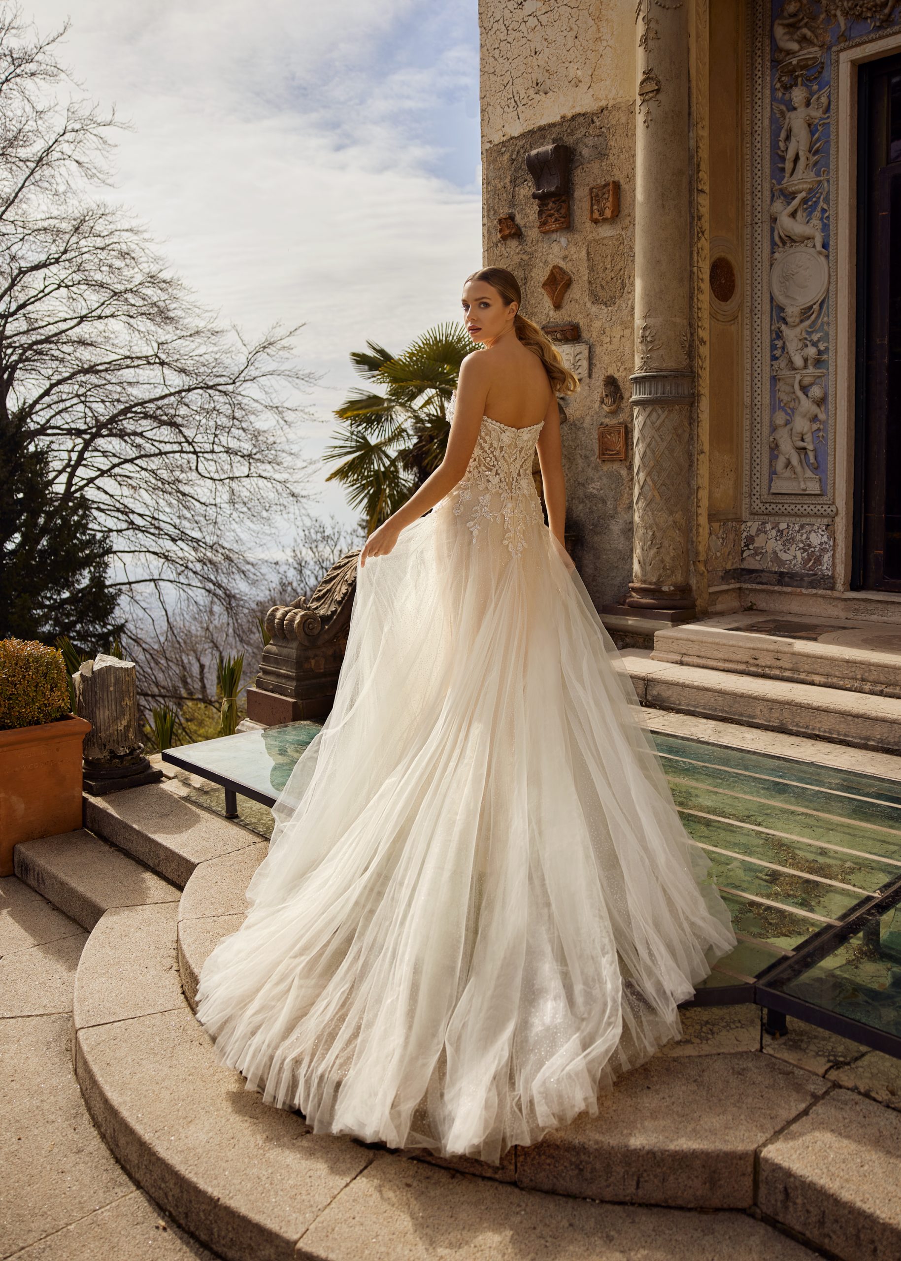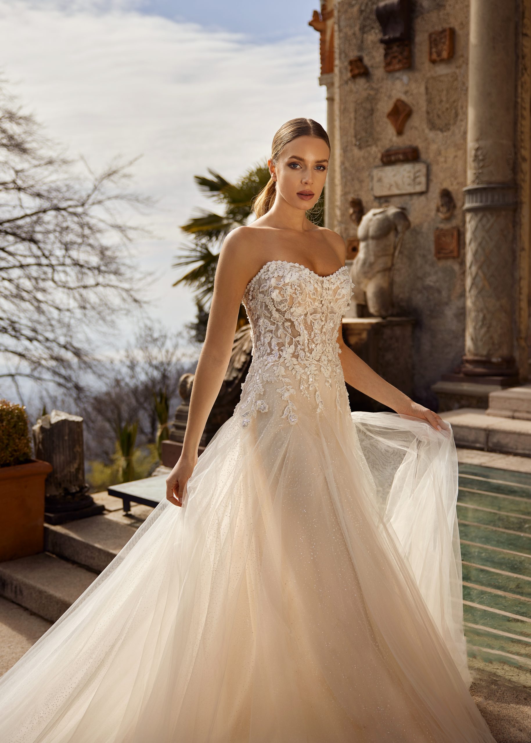 Fiona is a modern romantic gown. It has a classic strapless sweetheart neckline that flows into the mid back. Fiona’s sparkle tulle skirt has godets that start at the hip to create a subtle a-line flare. It is embellished with lace appliques on the bodice that end at the top of the godets. It also has a dainty lace that borders the bodice neckline from front to back. Fiona is for a bride that wants a charming modern look.