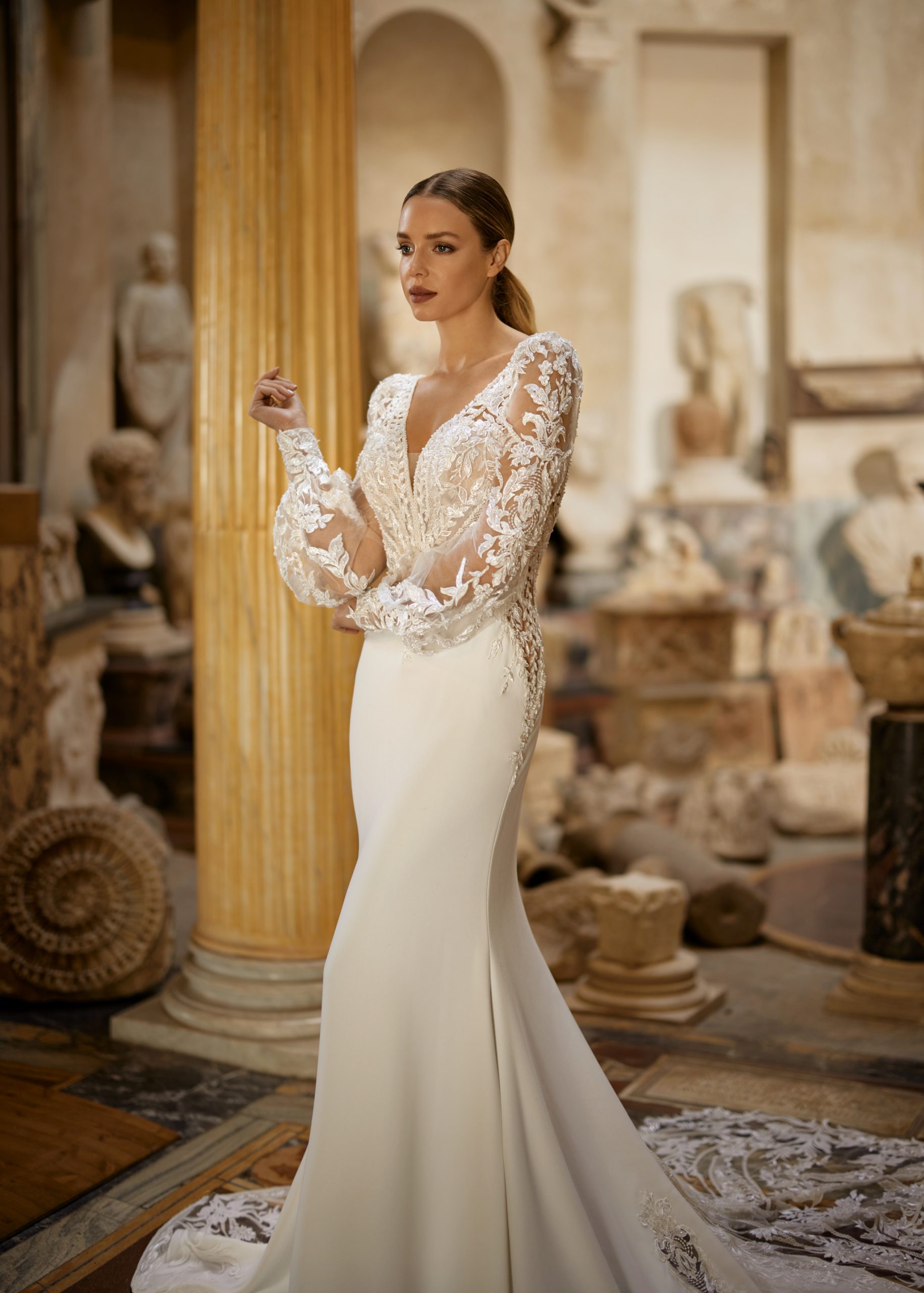 Fischer is a traditional fit and flare crepe gown with a modern take. The tulle bodice has a plunging v-neckline that starts from the straps on the shoulder. The back of the bodice falls onto the low back with a sheer illusion. It has detachable billowing sleeves that are fitted at the wrist, creating two looks in one. Fischer is embellished with lace applique on the bodice, the sleeves, and trickles down the sides of the skirt, ending at the hips. The crepe skirt is a clean look that flares down into the long scalloped train. The hem of the train is a tulle that is decorated with the matching lace appliques from the bodice and sleeves. Fischer has two looks in one for a bride that wants a modern and classic look.