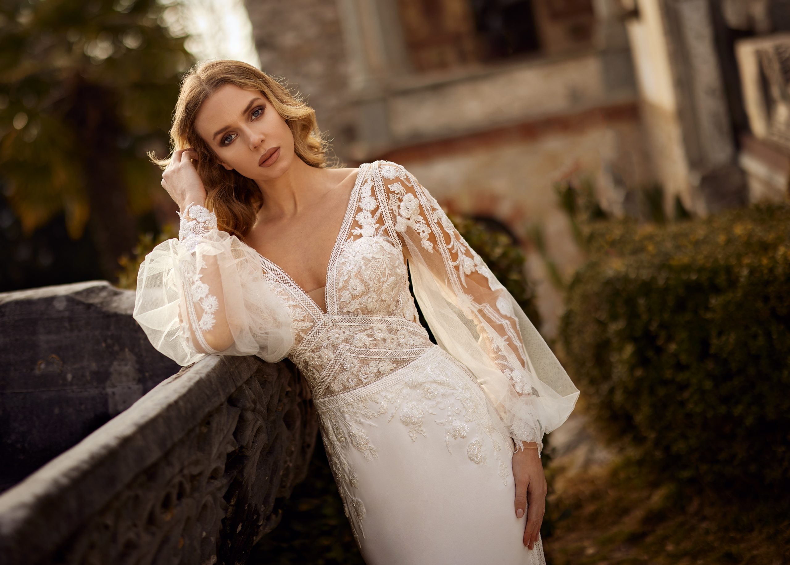 Foster is a modern romantic fit and flare gown. It has a deep v-neck on the front and back with embroidered tulle straps. Foster comes with detachable two-layered sheer billowing sleeves. This gown is detailed with geometrical and floral embroidered lace on the top and flowing down each side into the crepe skirt. The geometrical lines meet at a point on the bodice waistline, accentuating the body. Foster’s sleek crepe skirt beautifully balances the details of the top and sleeves for a bride who wants both a touch of romance and sexiness.