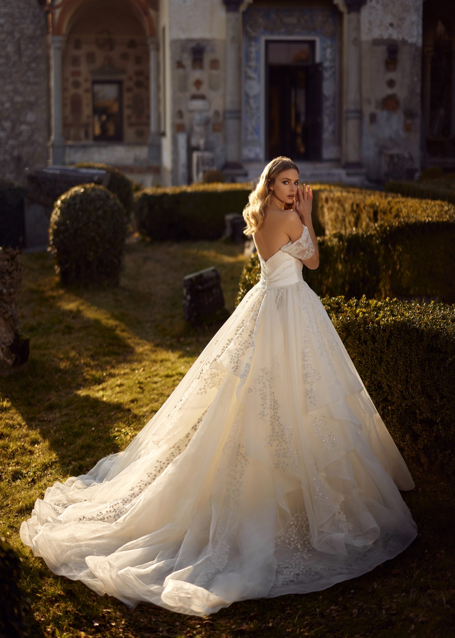 Francesca is a sparkling tiered ballgown. It has a draped strapless v-neck mikado top with detachable off the shoulder tulle straps. The top is also draped in the back meeting in the center with crystal buttons along the top of the zipper to the v-pointed waistline. Francesca is detailed with sparkle sequins along the tiered tulle skirt and the straps. This is a glistening princess gown for a fairytale wedding.
