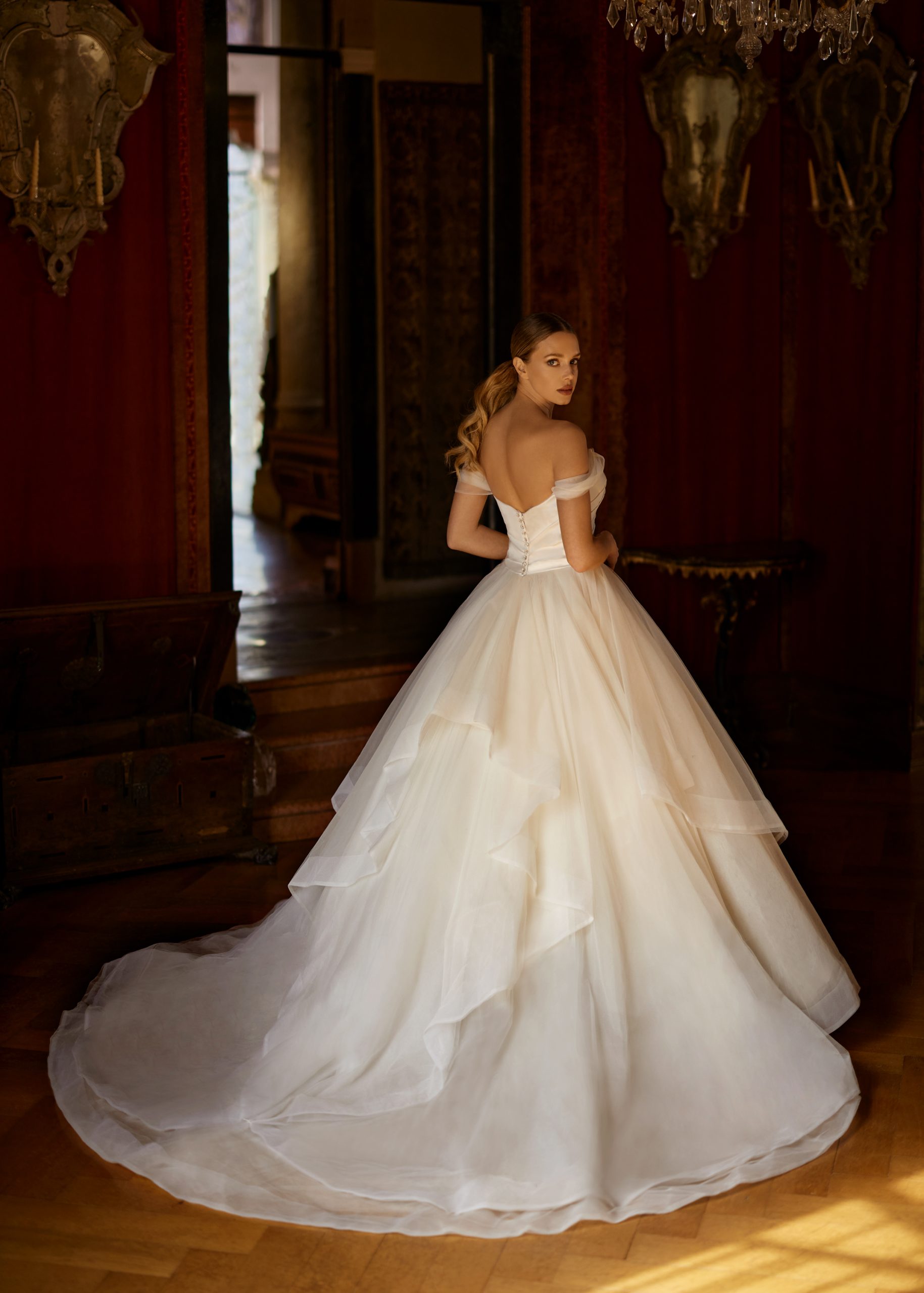 Francis is a classic and elegant tiered ballgown. It is the more traditional and simple sister gown to Francesca. It has a draped strapless v-neck mikado top with detachable off the shoulder tulle straps. The top is also draped in the back meeting in the center with crystal buttons along the top of the zipper to the v-pointed waistline. Francis is detailed with the sheen of the beautiful fabric and silhouette of the tiered tulle skirt. This dress is both traditional and modern for a bride who wants both.