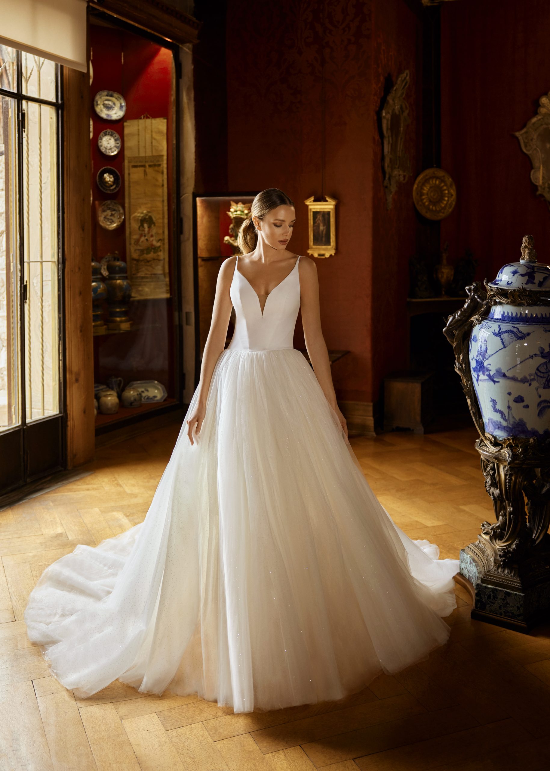 Frenchie is a fun and elegant ballgown with a crepe top and a beautiful sparkle tulle skirt. It has a deep v-neck top with princess lines in the front, and a scooped mid-back that flows into a pointed waist. Frenchie has a playful touch with detachable crepe bows that detail the thin straps on the top. This dress is perfect for a classy and flirtatious bride.