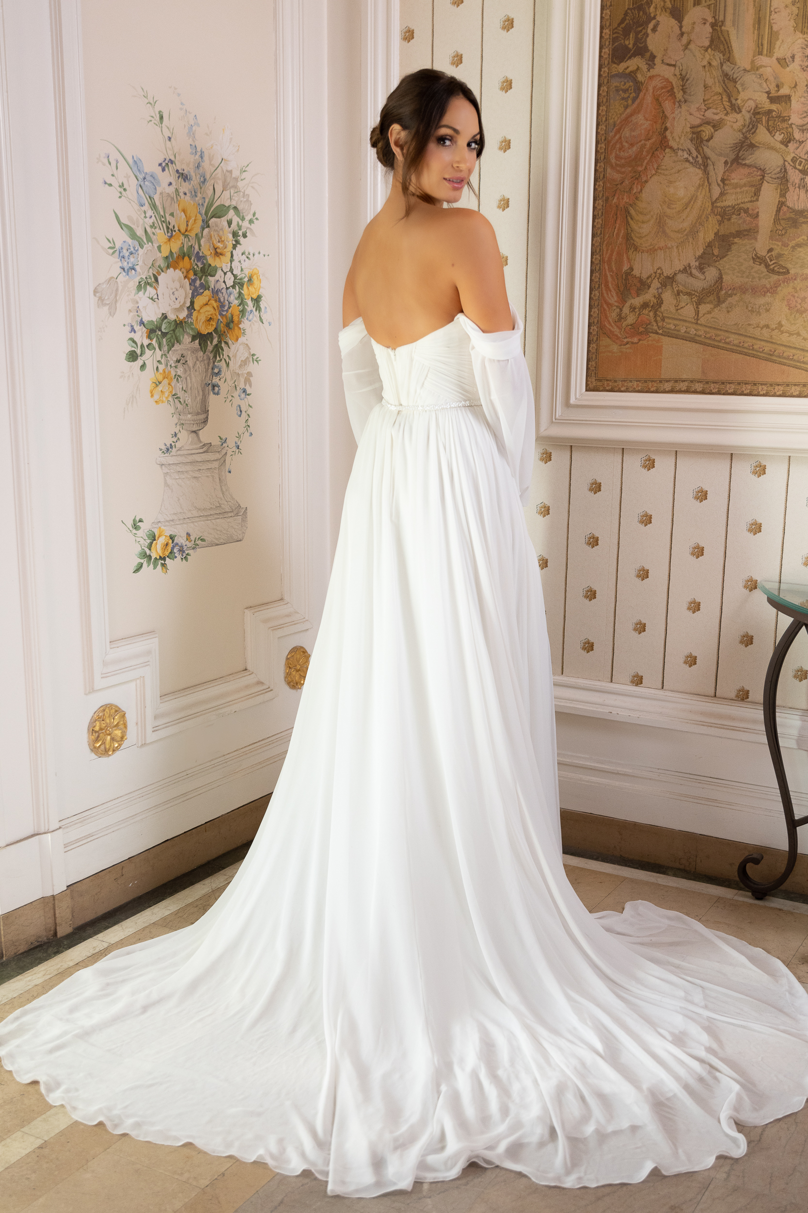 Esther is a soft a-line dress with a wide v-neckline. The front flows into a mid-back scoop. The bodice has ruching that moves in an inward motion accentuating the figure. This is a simple gown that is detailed by the ruching on the top and the gathers on the skirt that leads to a train in the back. Esther comes with detachable off-the-shoulder straps and long sleeves, a slim beaded belt for the waist, and a detachable skirt lining.