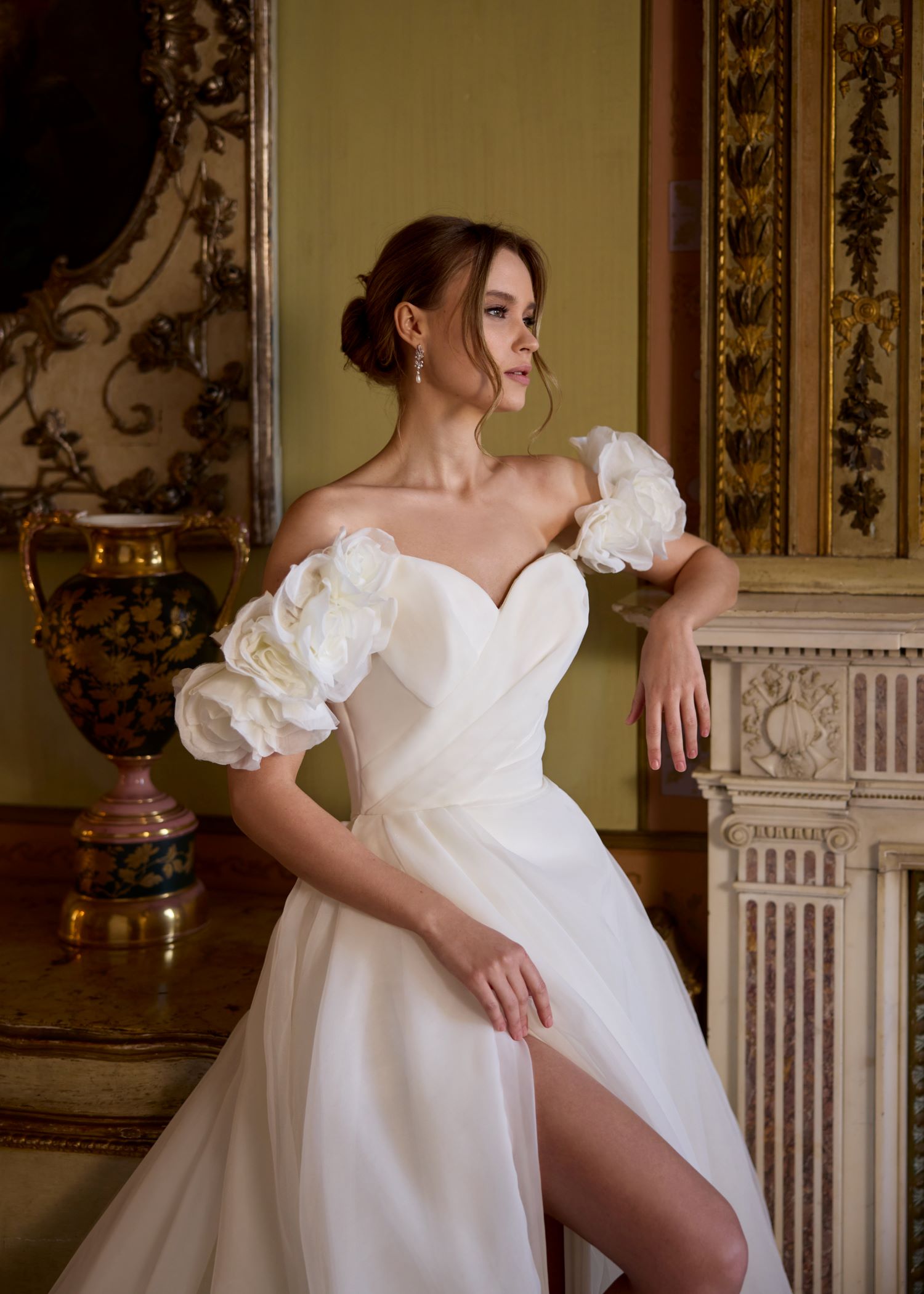 Stunning wedding dress with statement flowers on the train.