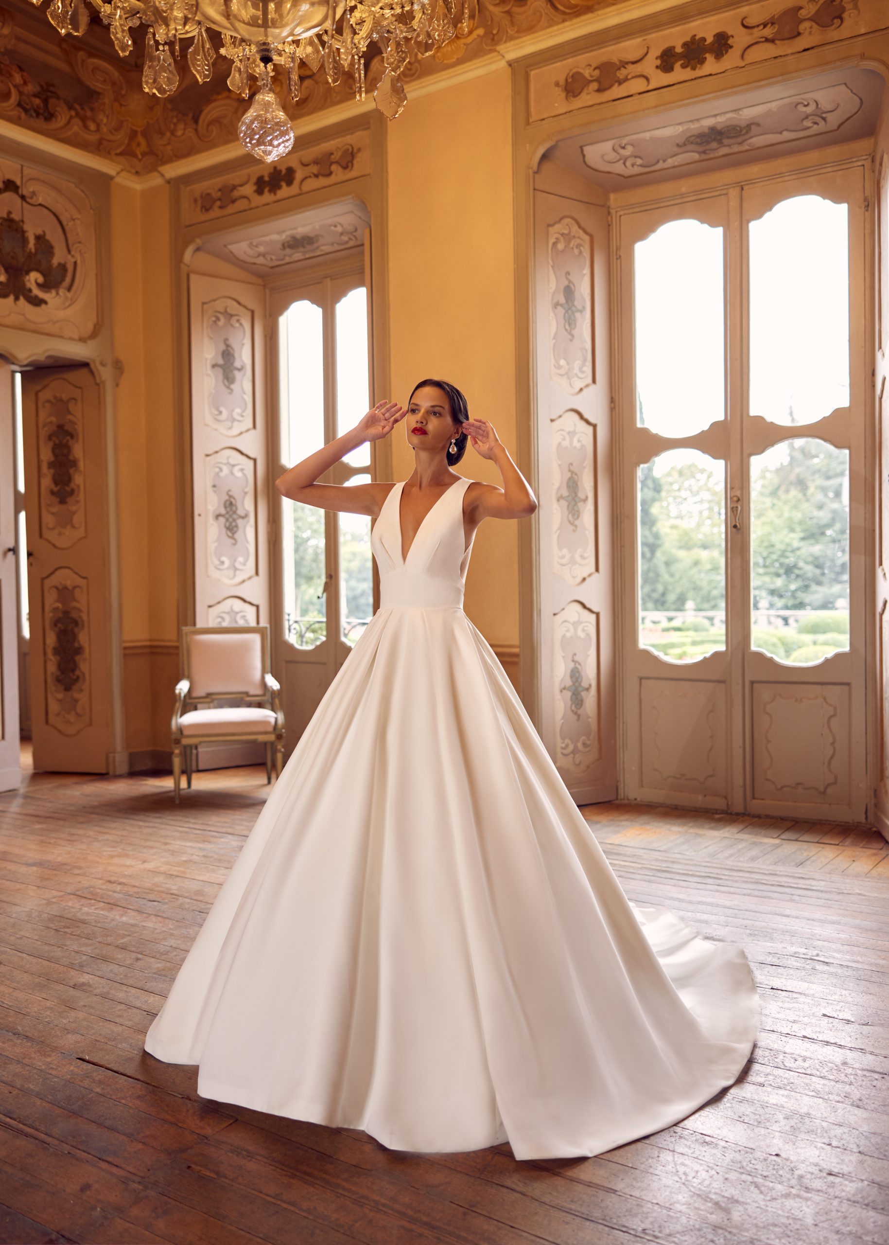 Sophisticated matte satin ball gown with plunging neckline and sheer back donned with various sized bows