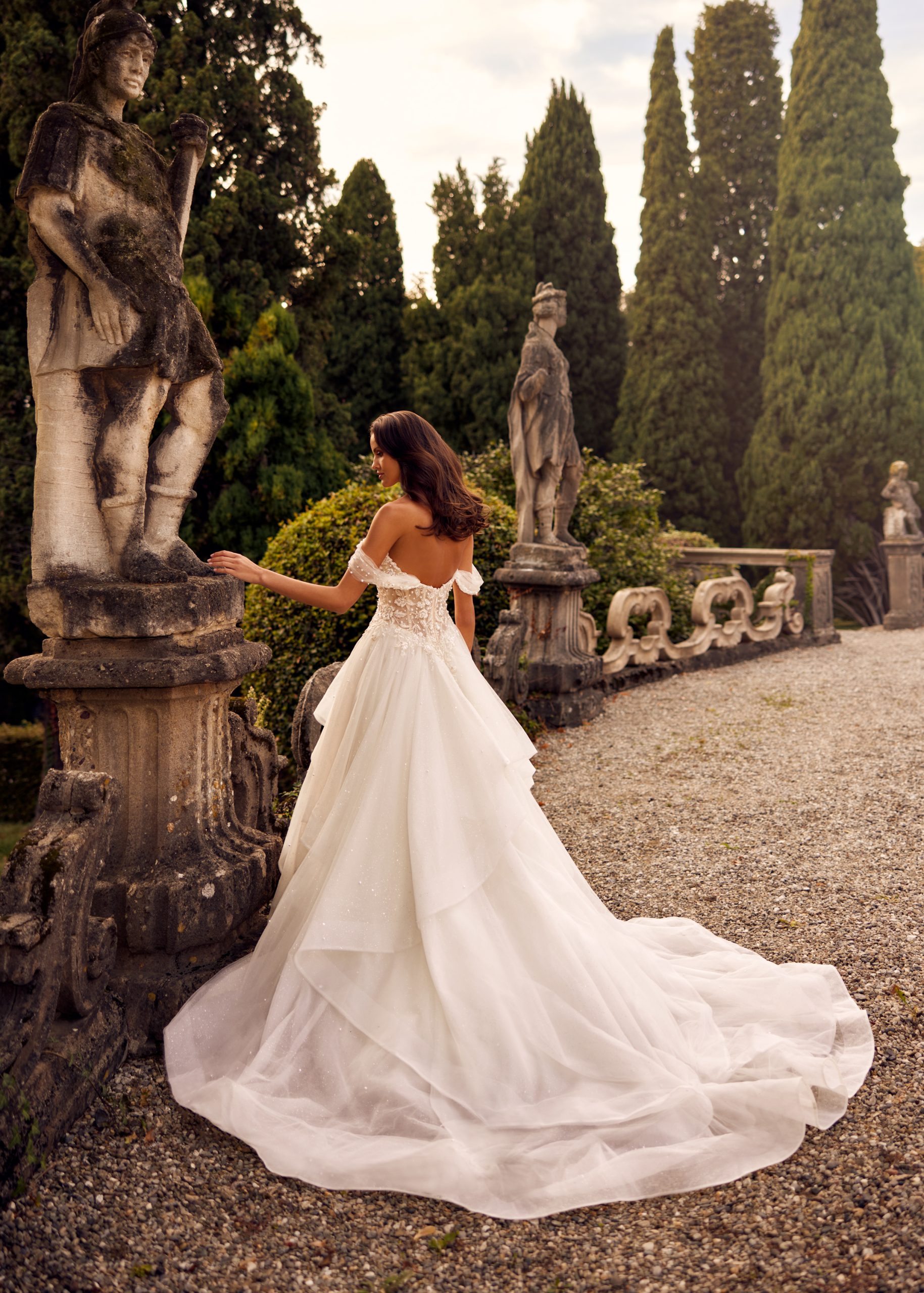 Gloria is an elegant sparkling ballgown with cascading layers in the skirt. It has a scooped cat-eye neckline and a mid-rise back with a v-point waistline. The entire bodice is embellished with glistening pearls and beading and has boning throughout. The embellishments trickle past the waist for a flawless transition into the skirt. The skirt is made from a glitter tulle with pearl detailing scattered throughout. Horsehair trim along the tiers adds extra structure to the skirt. Gloria has matching detachable off-the-shoulder straps that drape effortlessly on the arms. This gown is perfect for an ethereal bride looking for a princess-like dress.