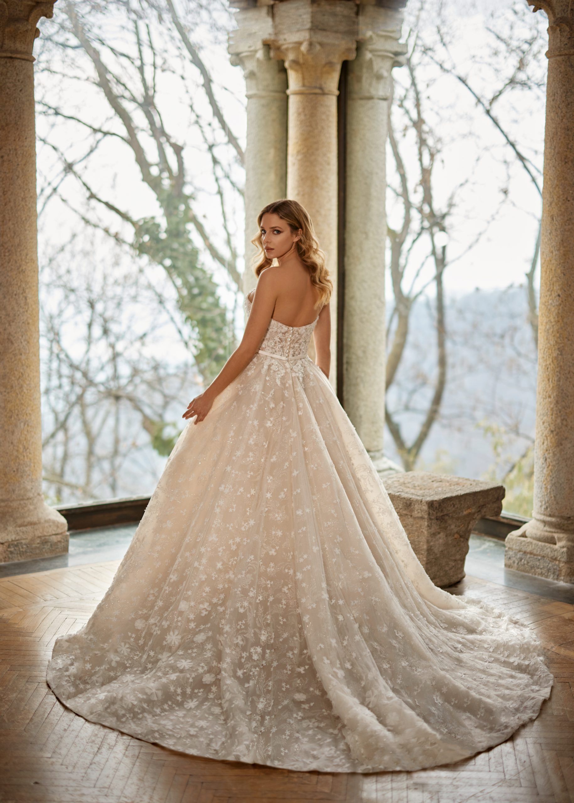 Felicity is a glistening romantic ballgown. It has a structured strapless scoop neck top that flows beautifully to a mid scoop back. Felicity shines with the touch of sparkle tulle and beautiful three-dimensional floral appliques. This gown comes with a detachable belt that sits at the waist and attaches to the buttons along the back adding a classic touch. Felicity is perfect for a dreamy fairytale wedding.