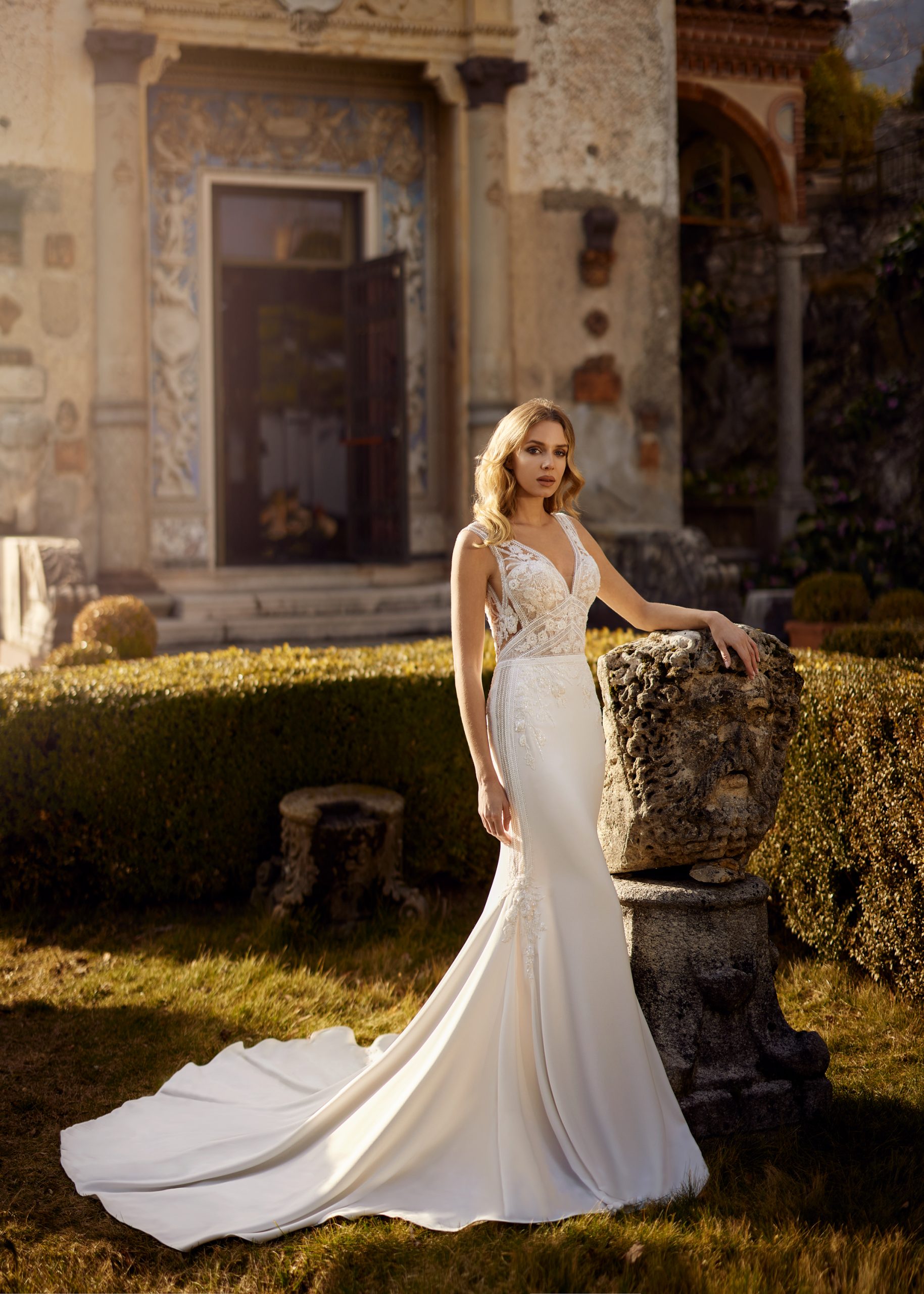 Foster is a modern romantic fit and flare gown. It has a deep v-neck on the front and back with embroidered tulle straps. Foster comes with detachable two-layered sheer billowing sleeves. This gown is detailed with geometrical and floral embroidered lace on the top and flowing down each side into the crepe skirt. The geometrical lines meet at a point on the bodice waistline, accentuating the body. Foster’s sleek crepe skirt beautifully balances the details of the top and sleeves for a bride who wants both a touch of romance and sexiness.