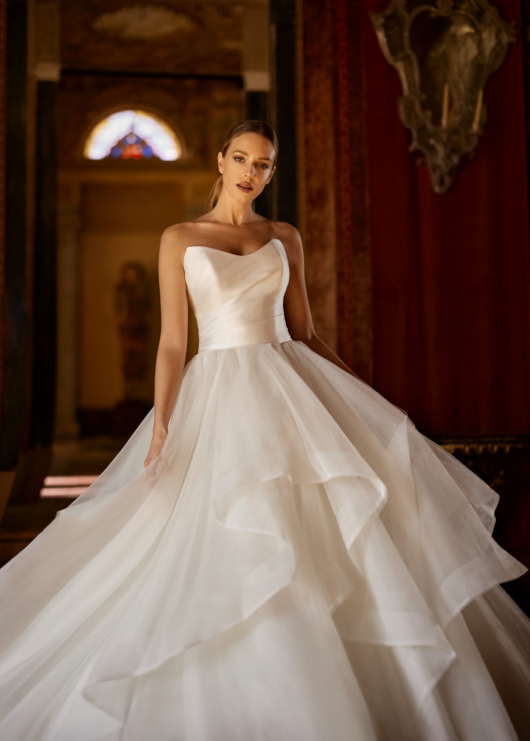 Francis is a classic and elegant tiered ballgown. It is the more traditional and simple sister gown to Francesca. It has a draped strapless v-neck mikado top with detachable off the shoulder tulle straps. The top is also draped in the back meeting in the center with crystal buttons along the top of the zipper to the v-pointed waistline. Francis is detailed with the sheen of the beautiful fabric and silhouette of the tiered tulle skirt. This dress is both traditional and modern for a bride who wants both.