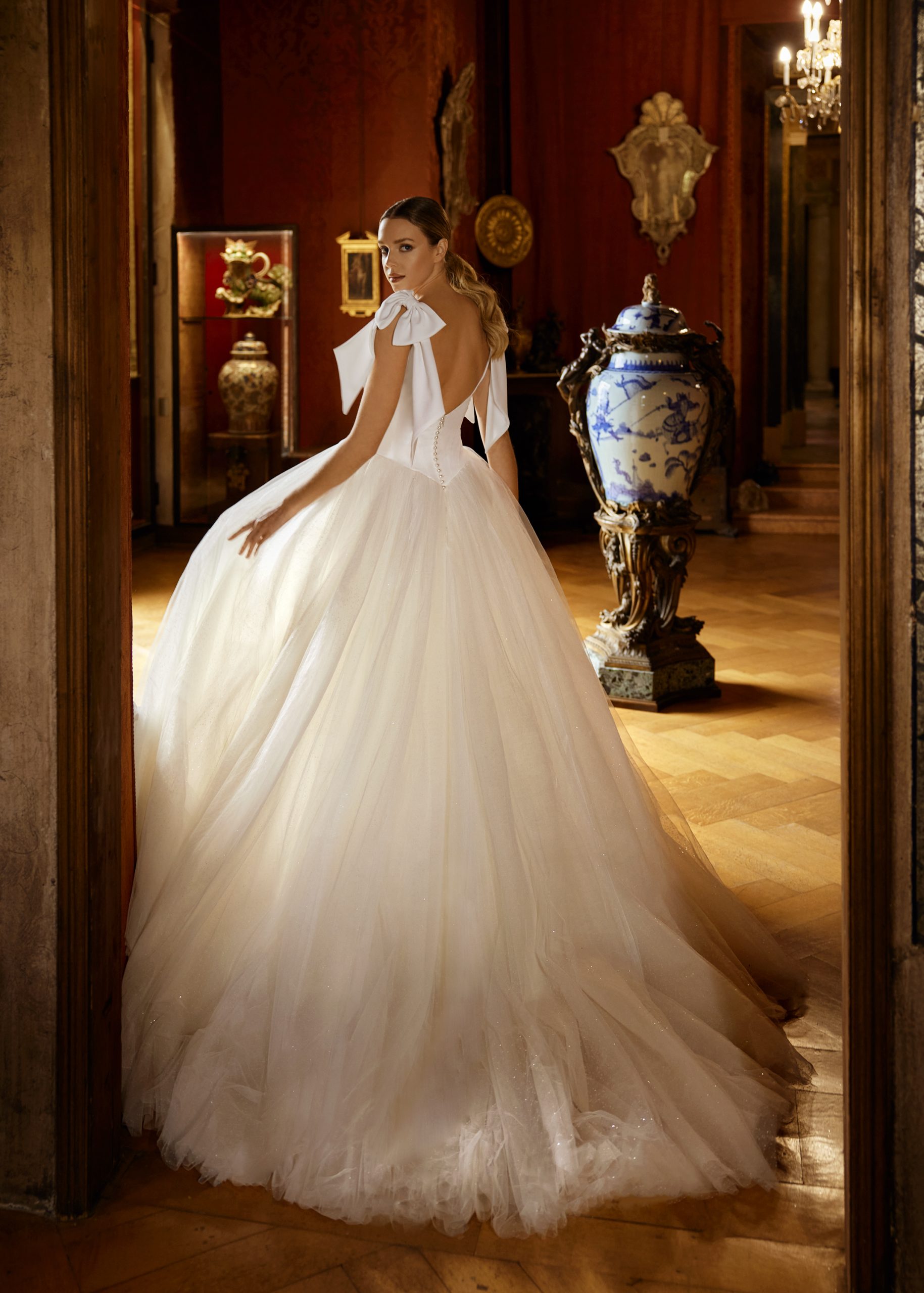 Frenchie is a fun and elegant ballgown with a crepe top and a beautiful sparkle tulle skirt. It has a deep v-neck top with princess lines in the front, and a scooped mid-back that flows into a pointed waist. Frenchie has a playful touch with detachable crepe bows that detail the thin straps on the top. This dress is perfect for a classy and flirtatious bride.