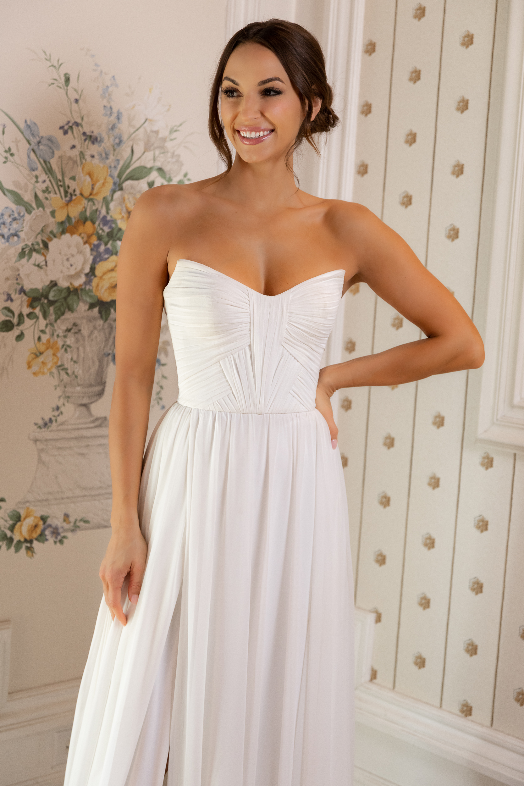 Esther is a soft a-line dress with a wide v-neckline. The front flows into a mid-back scoop. The bodice has ruching that moves in an inward motion accentuating the figure. This is a simple gown that is detailed by the ruching on the top and the gathers on the skirt that leads to a train in the back. Esther comes with detachable off-the-shoulder straps and long sleeves, a slim beaded belt for the waist, and a detachable skirt lining.