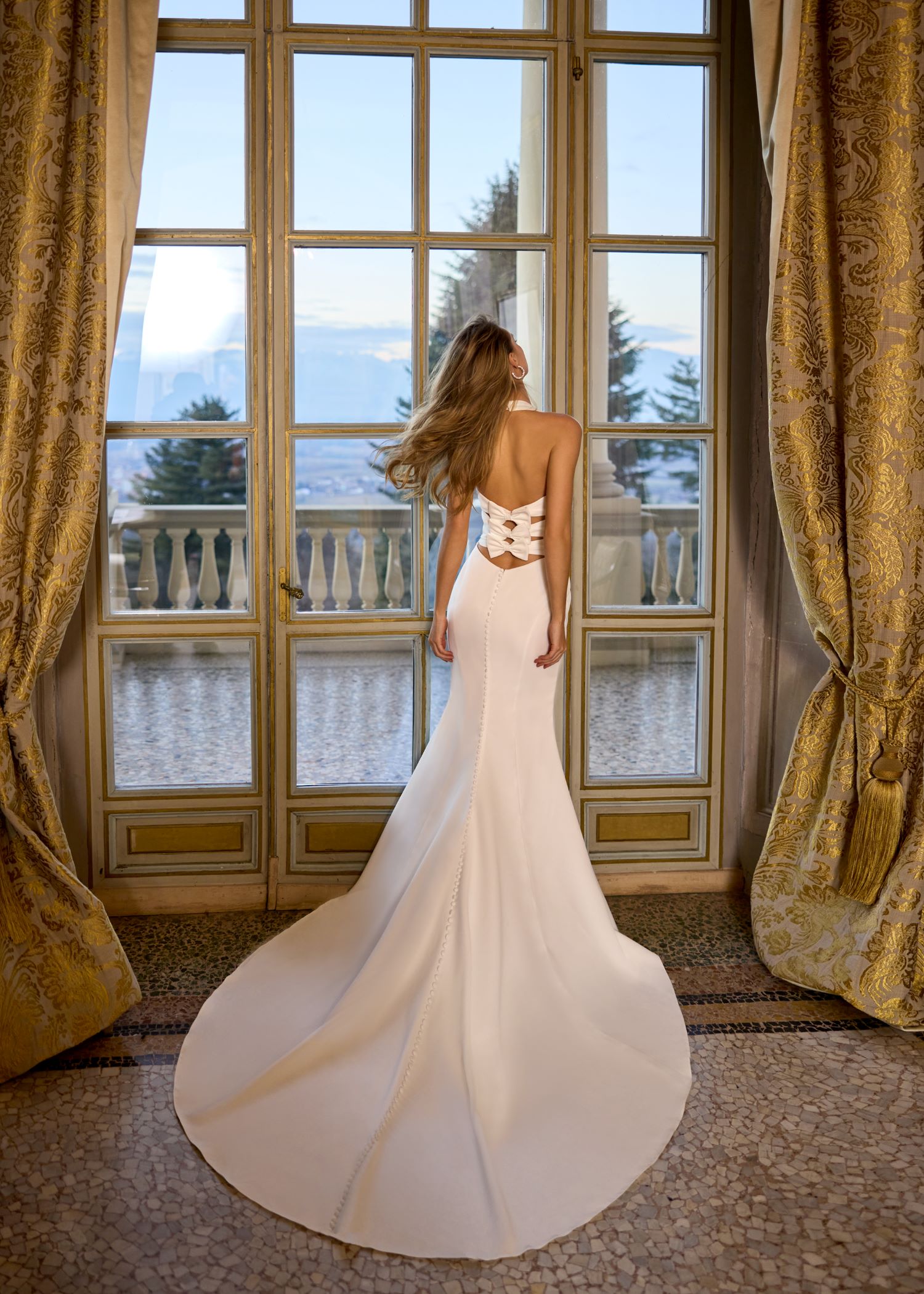 Feminine fit and flare wedding dress with bow at the back.