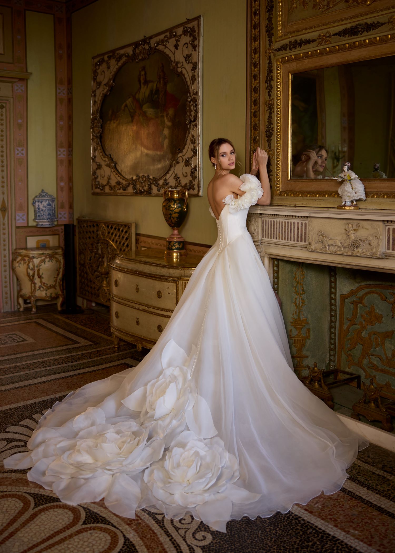 Stunning wedding dress with statement flowers on the train.