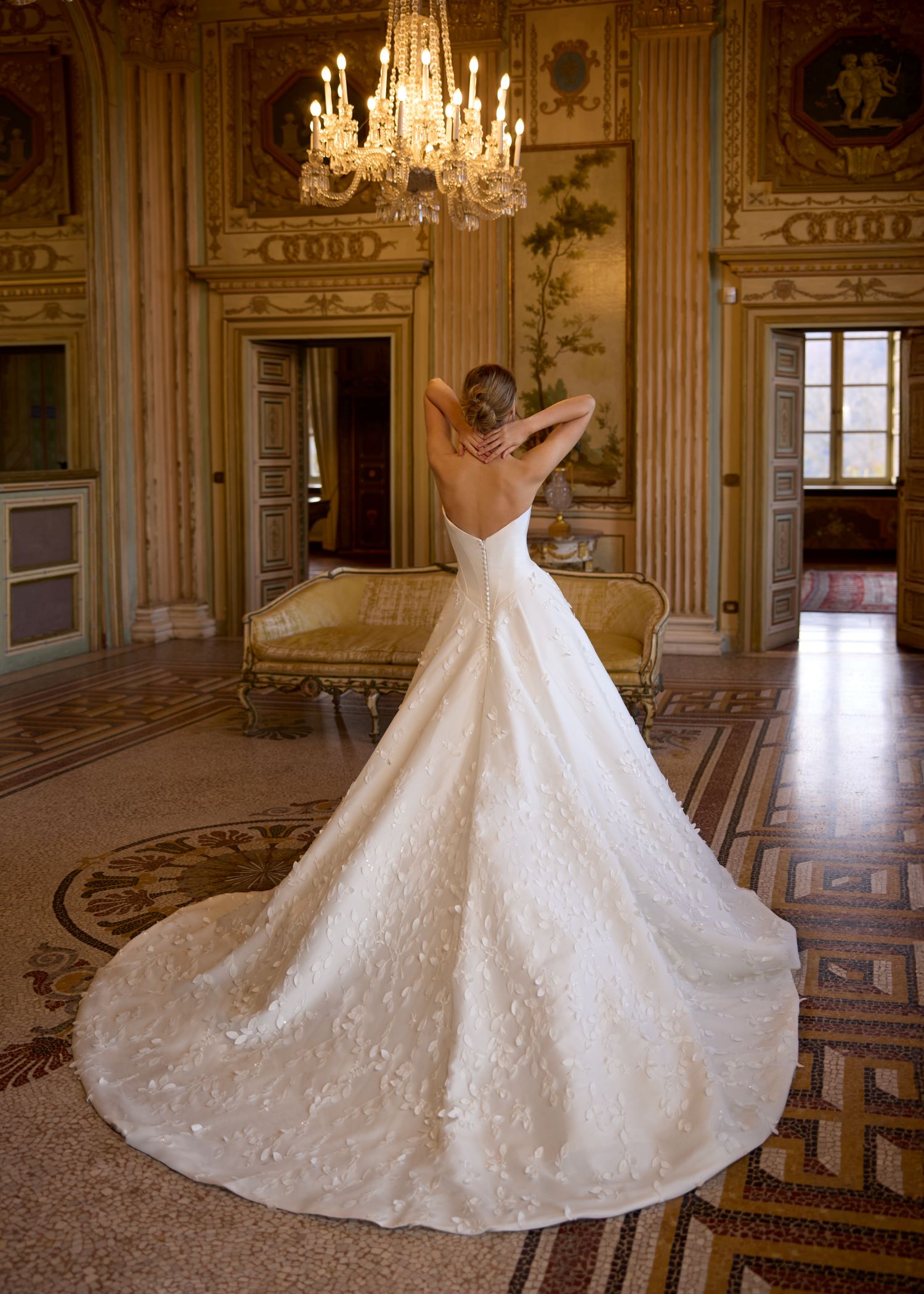 Regal ballgown with sophisticated details on the skirt.