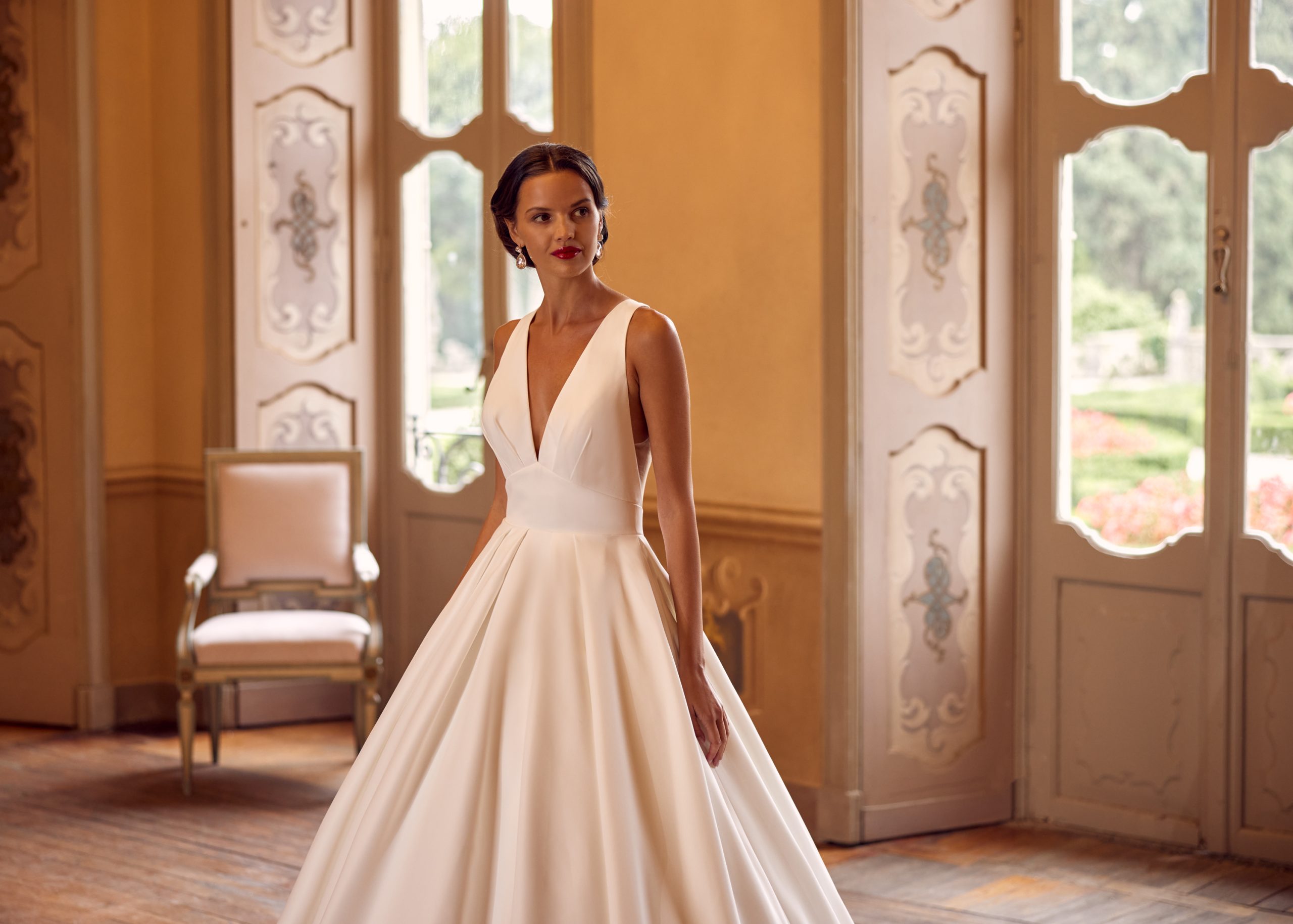Sophisticated matte satin ball gown with plunging neckline and sheer back donned with various sized bows